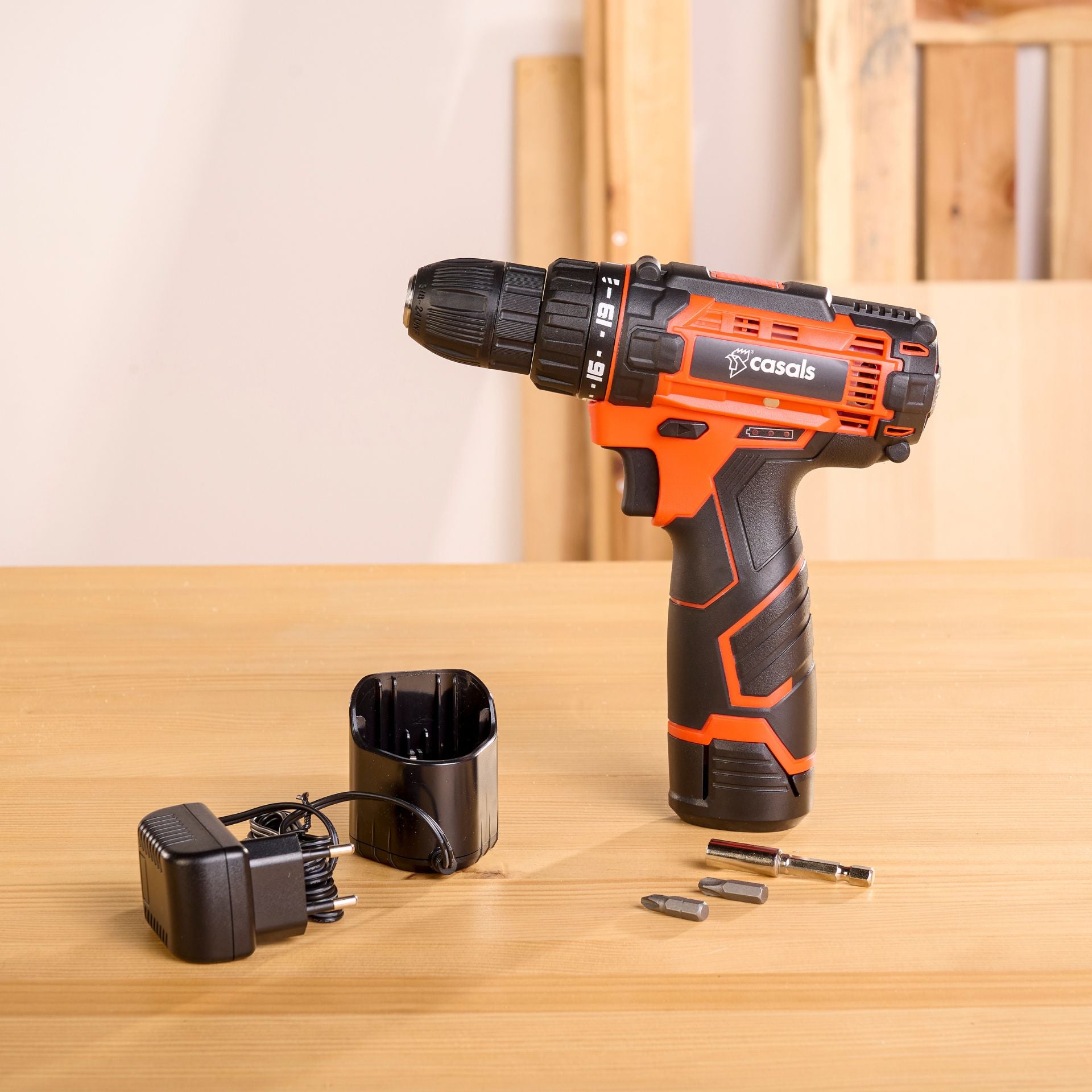 It includes a practical hard plastic case with a handle, with moldings inside that keep the drill firmly held. In addition, it includes the charger, a set of 6 drill bits of different sizes, 6 screwdriving bits with different heads, and a hexagonal adapter.