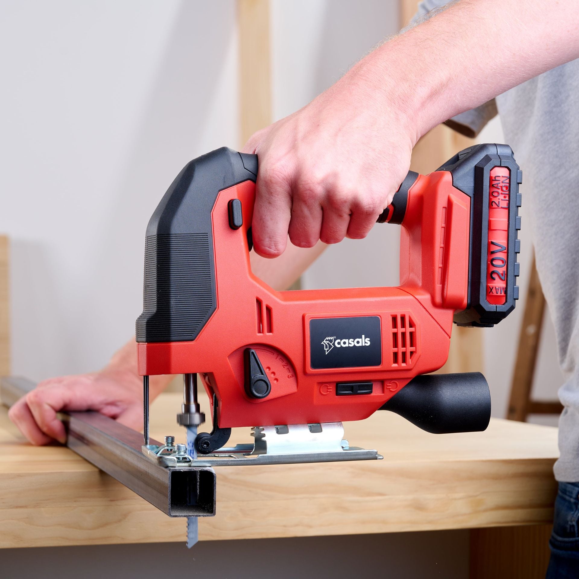 Solo tienes que activarla y cortar cualquier material en un momento. Se adapta perfectamente a la mano y tiene mucha estabilidad. Para asegurar un corte recto incluye una guía metálica que puedes colocar en la base de la sierra. Incluye, también, una batería de 20V y 2.0Ah, un cargador, una llave allen para desplazar la base y una hoja de corte universal.