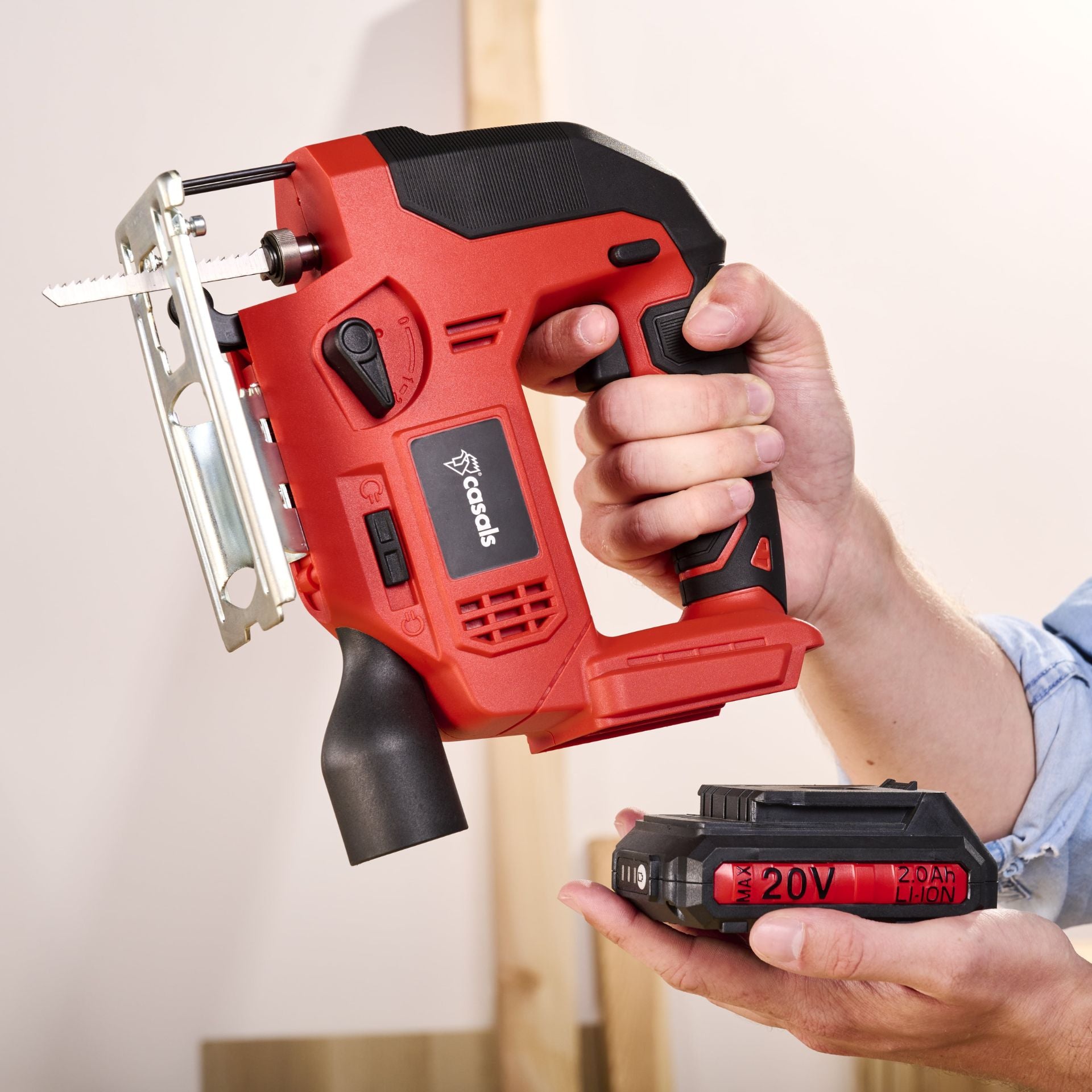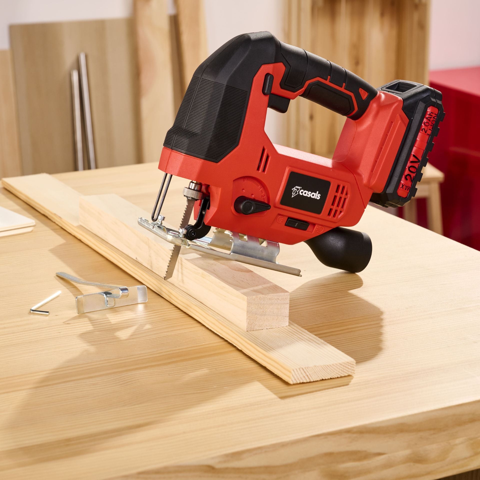 Sierra caladora con batería de 20V de la gama ONE POWER LITHIUM 20V, con batería extraíble e intercambiable con el resto de herramientas de la misma gama. Incluye sistema Quick Fix, para fijar la hoja de corte en un solo movimiento y sin tornillos, corte pendular regulable en 3 niveles distintos y Double Blow, que permite escoger la dirección de salida del aire del motor.